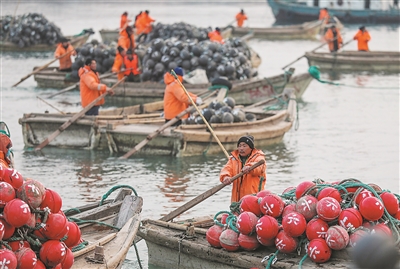 3月9日,在山东荣成俚岛湾畔,渔民们驾船在码头集结,准备前往藻类养殖区进行作业。