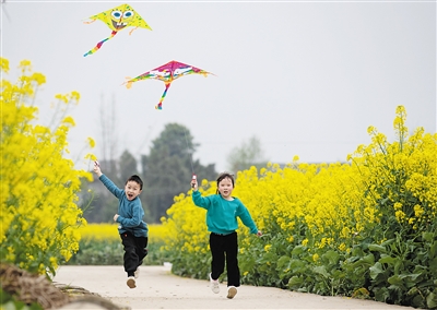 3月14日,小朋友在安州区秀水镇龙泉村放风筝。