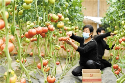 3月18日,工人在石家庄市高邑县岗头村一家农业产业孵化园采摘西红柿。