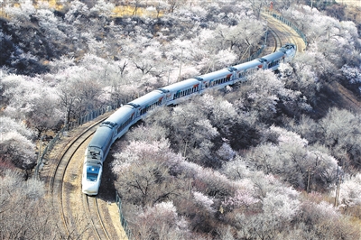 春暖花开时节,在北京居庸关长城脚下,市郊铁路S2线列车穿行花海之中,美景如画。新华社发 郭俊锋摄