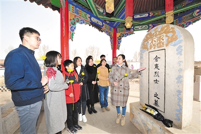 3月28日,大同大学新闻学院10余名师生代表前往云州区党留庄乡党留庄村仓夷烈士墓,聆听这位新闻战线烈士的英雄事迹介绍,深切缅怀英烈。该院充分利用大同本地红色教育资源,对师生进行生动的爱国主义教育和党史学习教育。 本报记者 于宏摄