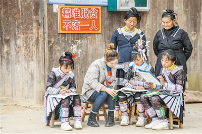 13岁的潘努阶抱着书本从陡坡上的家中下来,喊上同伴潘污简,一同走进村路边的潘乃党家。3位同读六年级的女孩在一张方桌旁坐下,打开书本开始做作业。“一天一章,我们得按时把寒假作业做完,新学期开学交给老师检查。”潘努阶说,相约学习,是她们近年来养成的习惯。