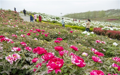 近日,陕西省汉中市洋县朱鹮梨园景区的万亩牡丹园里,200多个品种的牡丹竞相开放,形成“龙凤呈祥 花开富贵”的吉祥图案,令游客流连忘返。