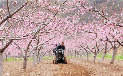 清明时节,万物生长。随着气温逐渐升高,多地农民抢抓农时,开展春耕春种,一派忙碌景象,绘出一幅幅生机勃勃的春耕画卷。图为4月5日,河北省石家庄市井陉县测鱼镇杨庄村村民驾驶农机在桃园里作业。新华社发(张秀科摄)