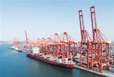 今年1至3月份,唐山港京唐港区完成货物吞吐量6993万吨,同比增长10.29%,集装箱吞吐量42.41万标箱,同比增长64.69%,实现首季“开门红”。图为4月8日,一艘轮船靠泊在唐山港京唐港区集装箱码头装货(无人机照片)。
