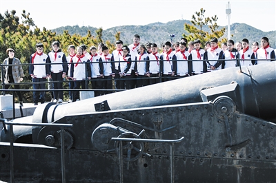 4月13日,学生在总体国家安全观刘公岛教育培训基地参观东泓炮台旧址。