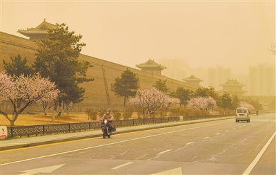 中央气象台4月15日发布沙尘暴蓝色预警。预报显示,15日8时至16日8时,新疆东部和南疆盆地、青海西北部、甘肃中西部、内蒙古中西部、宁夏、陕西中北部、山西、北京、天津、河北、河南、山东中西部、安徽中北部、江苏北部等地将出现扬沙或浮尘天气,其中内蒙古中西部部分地区有沙尘暴。图为昨日中午沙尘暴来袭时的大同古城街景。