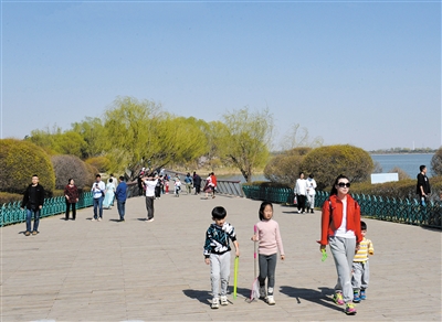 4月18日,我市气温大幅回升,市民们纷纷走出家门,享受春天惬意的阳光。图为在文瀛湖生态公园游园踏青的市民。
