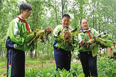 4月25日,安徽省淮北市第三实验小学在杜集区徐暨村开展户外劳动课堂活动。小学生们体验除草、整地、栽种等农事劳动,培养热爱劳动的良好习惯。图为淮北市第三实验小学的学生在田间收获莴笋。