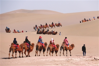 4月25日,游客在甘肃省敦煌市鸣沙山月牙泉景区游览。