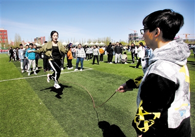 “五一”假期,山西大同大学举办了内容丰富、形式多样的趣味活动赛。此次活动,在发挥校园体育活动育人塑人功能的同时,凝聚了师生力量,弘扬了同大精神。图为5月1日上午,大学生们正在参加活动。