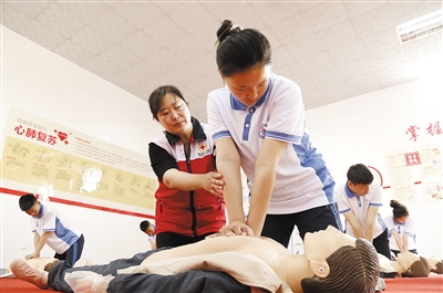 5月8日世界红十字日到来之际,河北多地开展“急救知识进校园”活动,向学生传授心肺复苏、包扎等应急救护知识,提高学生紧急避险意识和应急救护能力。 新华社记者 张驰摄