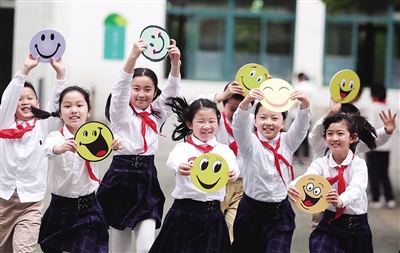 5月7日,江苏省扬州市汶河小学的学生们在“笑迎世界微笑日”活动中手举笑脸卡做游戏。世界精神卫生组织将每年的5月8日定为“世界微笑日”,希望通过微笑促进人类身心健康,增进社会和谐。 新华社发 (孟德龙摄)