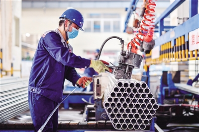 5月7日,工人在由天津转移而来的唐山正元管业有限公司车间内打包管材。