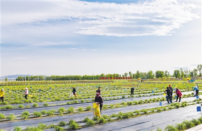 5月8日,云州区唐家堡村农民抓紧农时,在有机黄花标准化种植基地内安装粘虫板。 本报记者 张占兵摄