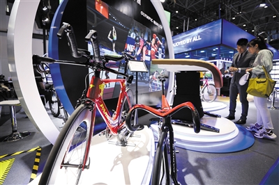 5月7日,观众在消博会现场咨询展出的国产全碳互换变速计时车。 在首届中国国际消费品博览会上,众多融入潮流元素的国货分外亮眼,引人驻足。高品质、更时尚、更前沿的中国品牌焕发光彩,受到年轻消费者的青睐。 新华社记者 张丽芸摄