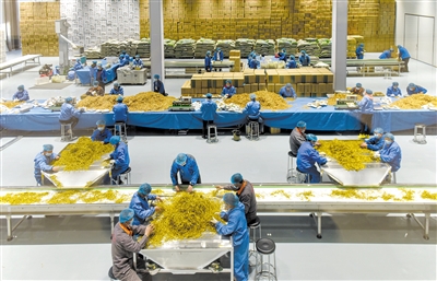 5月7日,坊城新村黄花产业园,火热的生产加工线一派繁忙。 本报记者 张燕伟摄