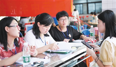 5月19日,广州市海珠区高校“优才计划”教师专场招聘会在华南师范大学举行。图为招聘学校代表在华南师范大学与应聘者(右)交流。。 新华社记者 邓华摄