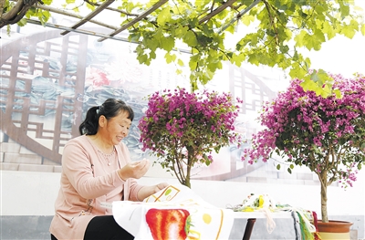 5月19日,邢台市襄都区晏家屯镇王家庄村村民在“美丽小院”绣十字绣。