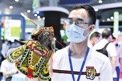 5月20日,在山东国际会展中心,漳州职业技术学院参会代表展示木偶戏技能。