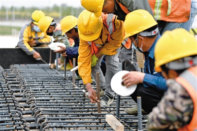 5月23日,中铁四局工人在河北省唐山市境内京唐铁路七标段施工现场绑扎钢筋。