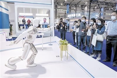 5月26日,参会者在数博会上观看一款能够浇花、递送饮料、踢球的智能机器人。