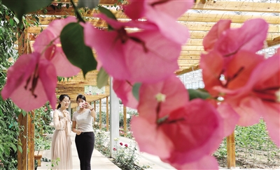 5月28日,游客在河北省河间市国欣现代农业产业园内拍照。
