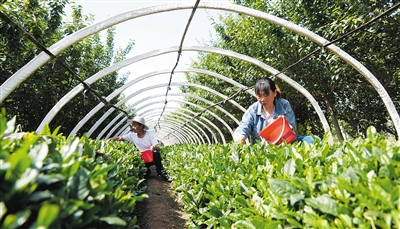 5月29日,村民在山东省泰安市泰山区省庄镇小津口村的茶园里采茶。