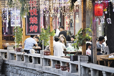 6月1日,游客在滦州古城内吃饭。河北省滦州市将文旅产业作为城市发展的新路径,在老城区建设滦州古城旅游景区。自2012年开城接待游客以来,滦州古城景区现已进驻商家700余家,曾经衰落的滦州老城区如今焕发新生,成为远近闻名的“网红打卡地”。 新华社记者 牟宇摄