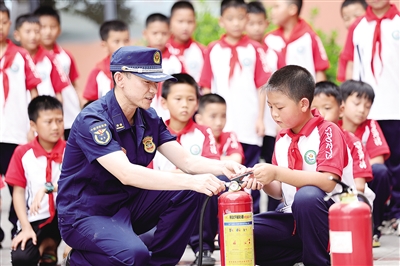 6月15日,在湖南省资兴市第二完全小学,消防员在向学生讲解灭火器的使用方法,通过宣讲消防安全知识、体验消防器材装备,提高学生的消防安全意识和安全自救能力。 新华社发 (李科摄)