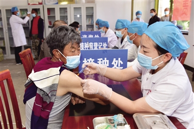 6月8日至30日,全市疫苗接种主要针对已经接种第一剂次的人群集中开展第二剂次接种。大同市灵丘县白崖台中心卫生院全力推进新冠病毒疫苗接种工作,采取定点接种、医务人员入村入户等方式对外出务工人员和留守人员分阶段开展疫苗接种,目前全乡常住人口首剂接种率完成90%以上。图为医护人员在冉庄村为村民接种新冠病毒疫苗。