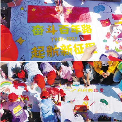 本次绘画活动的画幅大小为80cm×50cm。现场为学生们发放的小红帽以及小红旗贴纸,烘托出了浓浓的爱党、爱国氛围,他们纷纷拿起油画棒和马克笔进行现场创作,脸上都洋溢着童真阳光的笑容。