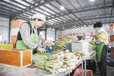 在宁夏吴忠市同心县下马关镇窖坑子村,农户将芦笋进行切割、打捆(6月23日摄)。据了解,下马关镇窖坑子村自2017年开始,依托当地气候和土壤条件,采取集约化种植、节水滴灌的方式发展旱地芦笋种植产业,目前已建成基地2000亩,亩均收益5000多元,并带动周边农民在家门口就业。 新华社记者 王鹏摄