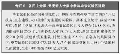民主监督的新实践。中共十八大以来,中共中央支持各民主党派加强对重大改革举措、重要政策贯彻执行情况和国家中长期规划中的重要约束性指标等的专项监督。自2016年起,中共中央委托各民主党派中央分别对口8个脱贫攻坚任务重的中西部省区,开展为期5年的脱贫攻坚民主监督工作,开辟了多党合作服务国家中心工作的新领域。各民主党派深入调研、坦诚建言,围绕贫困人口精准识别、精准脱贫等重点内容,提出一批有建设性的意见、批评、建议。据统计,各民主党派共有3.6万余人次参与脱贫攻坚民主监督工作,向对口省区各级中共党委和政府提出意见建议2400余条,向中共中央、国务院报送各类报告80余份,为打赢脱贫攻坚战作出重要贡献。