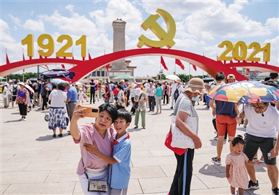 庆祝中国共产党成立100周年大会结束后,天安门广场迅速完成转换施工。7月2日恢复对外开放后,天安门广场庆祝景观吸引了大批游客前往拍照。据悉,天安门广场保留的景观将开放到7月15日。图为7月3日,游客们在广场拍照留念。