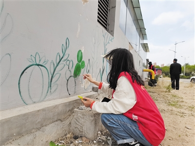 “经社区工作人员这么一装饰,原本破旧、被‘野广告’侵占的墙面变成了宣传文明的公益文化墙,可见工作人员下了很大功夫。”市民张大爷为大西街商城外围临街建筑的破旧墙面旧貌换新颜点赞。该处临街建筑面对西环路,墙面破损明显并有多处小广告,影响街区整体美观。在绘画老师的帮助下,社区工作人员及志愿者共同绘制,一幅幅生动的画面跃然墙上。
