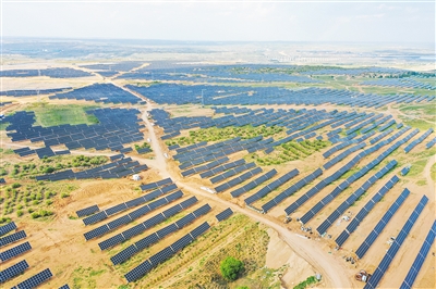 位于内蒙古伊金霍洛旗乌兰木伦镇的天骄绿能50万千瓦光伏发电项目是采煤沉陷区生态治理光伏发电的示范项目,项目占地面积约4.2万亩。目前,项目建设进入收尾阶段,预计年内并网发电。图为天骄绿能50万千瓦光伏发电项目局部(7月13日摄,无人机照片)。