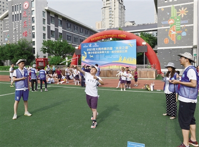 7月16日,2021年大同市第四届“未来之星”青少年阳光体育大会——航空模型比赛在平城区45校校园飞行营地开赛,来自我市11所小学的131名学生同场竞技放飞梦想。图为一级橡筋动力模型飞机竞时赛现场。 本报记者 戎禹仁摄