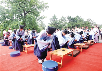 7月21日,我市多家幼儿园在府文庙举行大班毕业活动。孩子们身着学童汉服,在老师的带领下进行了庄重的“蒙童开笔礼”仪式。图为开笔礼“知礼明仪”环节小朋友们向老师行礼。