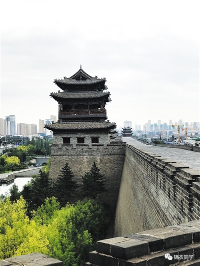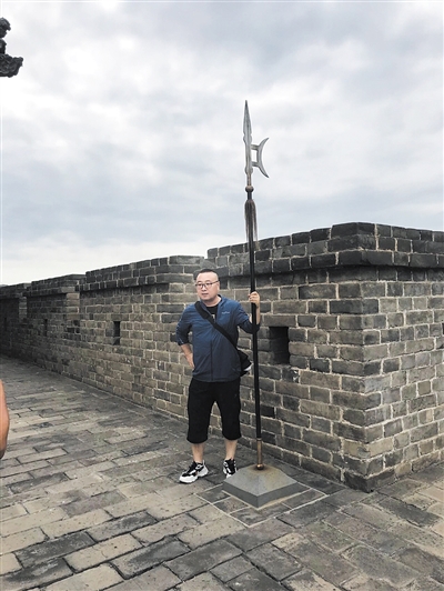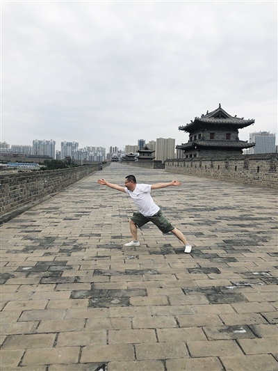 登上城墙,市八法拳研究会会长王占斌首先即兴表演了一段拳术,拍膝、平步抱肘、掐鸡捏嗉、乌龙卧式、拿法上肘、金砖扣玉瓦、龙形势等招势让成向阳大开眼界。城墙上的冷兵器对于王占斌似乎并不陌生,随便拿起一件,他都能讲出其中的来龙去脉。这让成向阳心生佩服:“王诗王拳”,名副其实。在城墙上漫步,成向阳对大同城墙有一种特殊的感情,每一块砖似乎在和他对话,每一座楼似乎在向他讲述那沧桑的往事。角楼、乾楼、望楼、箭楼在成向阳的心中镌刻下一段记忆。难怪他在回到太原后第一时间在自己的公众号“锦衣同学”推送了一篇《登城记》,文章通过一封写给一位叫“咏华君”的书信,讲述成向阳的大同城墙情结。