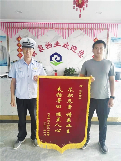 近日,碧水云天·博雅府小区业主郭先生,将一面写有“尽职尽责,情系业主;失物寻回,暖至人心”的锦旗送给物业保安陈健生,以表达他对小区物业和陈健生的深深谢意。