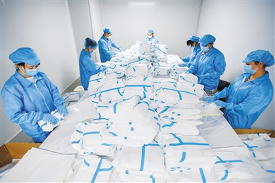 日前,为满足疫情防控需要,湖南省株洲市天元区内的医疗器械生产企业加紧医疗防控物资生产,全力保障医疗防控物资需要。图为8月5日,湖南一家生物科技发展有限公司的工人在整理、打包医用一次性防护服。