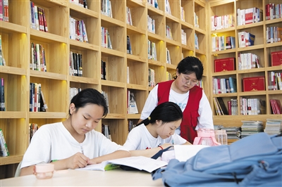 8月4日,在杏花岭区域党群服务中心,大学生志愿者张哲宇(右)为小朋友辅导作业。暑假以来,位于山西省太原市杏花岭区的杏花岭区域党群服务中心通过“社区+第三方+志愿者”的形式,免费为孩子们提供声乐、书法、环保等课程和活动,丰富了孩子们的暑期生活,也解决了家长们的后顾之忧。