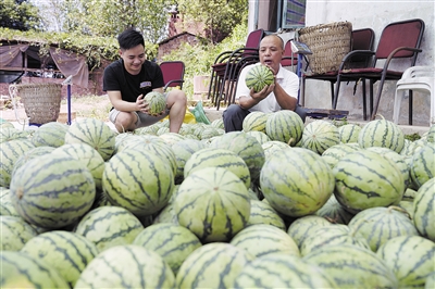 8月16日,西山坪村种植大户曾义(右)在挑选西瓜准备销售。