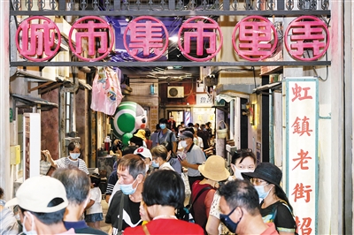 “城市集市”主题街区位于上海市虹口区北外滩一处商圈地下,该街区还原了上世纪90年代的上海弄堂,多家老字号老品牌以及已经停产的老物件等在这里“重生”,吸引众多市民前来参观游玩,带动消费。