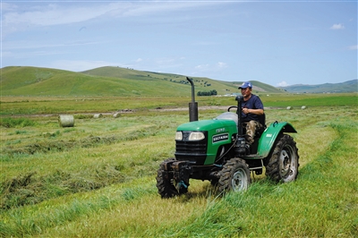 立秋过后,内蒙古兴安盟牧民驾驶机械开始打草工作,为牛羊过冬储备草料。