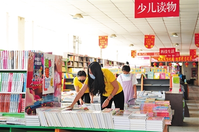 8月29日,孩子们在市新华书店选购教辅书籍。新学期即将到来,市新华书店组织回儿童文学、素质教育、智力开发、中外文学、科普百科、益智手工等方面万余种精品图书,以满足中小学生的购书需求。图为工作人员正在整理图书货架。