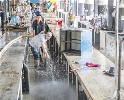 8月30日,在重庆市巫溪县宁河街道裕宁街菜市场,商户冲洗地面淤泥。