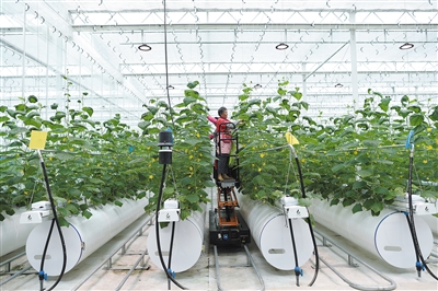 9月16日,工作人员在种植车间内乘轨道升降车对蔬菜进行日常管理。