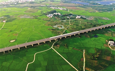 动车在广西宾阳县古辣镇的稻田间驶过(无人机照片,9月19日摄)。